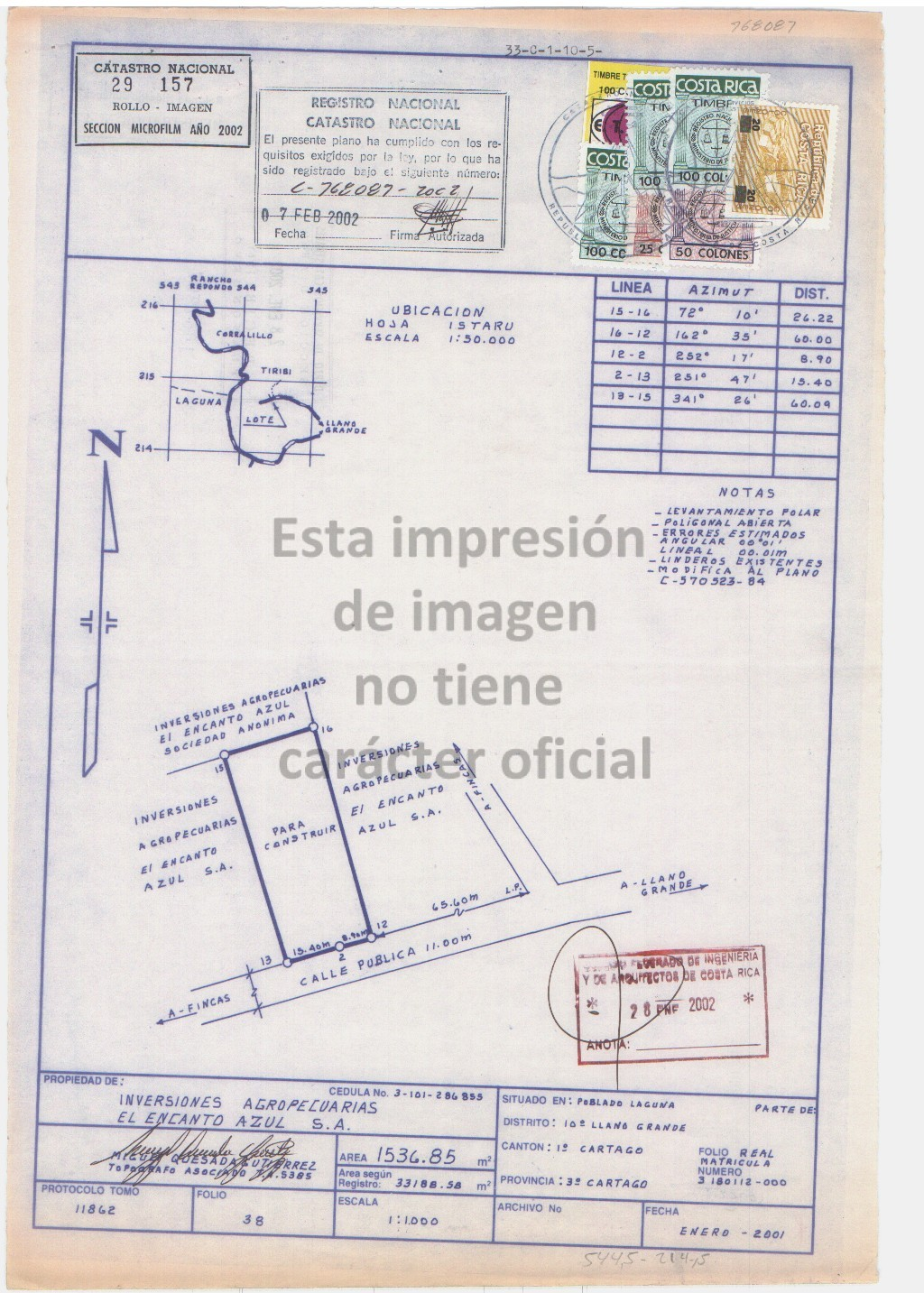 Nota: propiedad requiere delimitación y cercado de los vértices por parte de un topógrafo con mojones de cemento para definir el perímetro del terreno este gasto corre por cuenta del eventual adjudicatario, cualquier diferencia de cabida existente contra la comprobación de campo, quedará a discreción del comprador realizar los trámites legales para su reposición o rectificación, por lo que el comprador exonera al Banco Nacional de Costa Rica de cualquier responsabilidad presente o futura por el exceso o faltante y renuncia a cualquier reclamo posterior judicial y/o administrativo con la firma del cartel de venta y/o formulario de oferta de compra.
