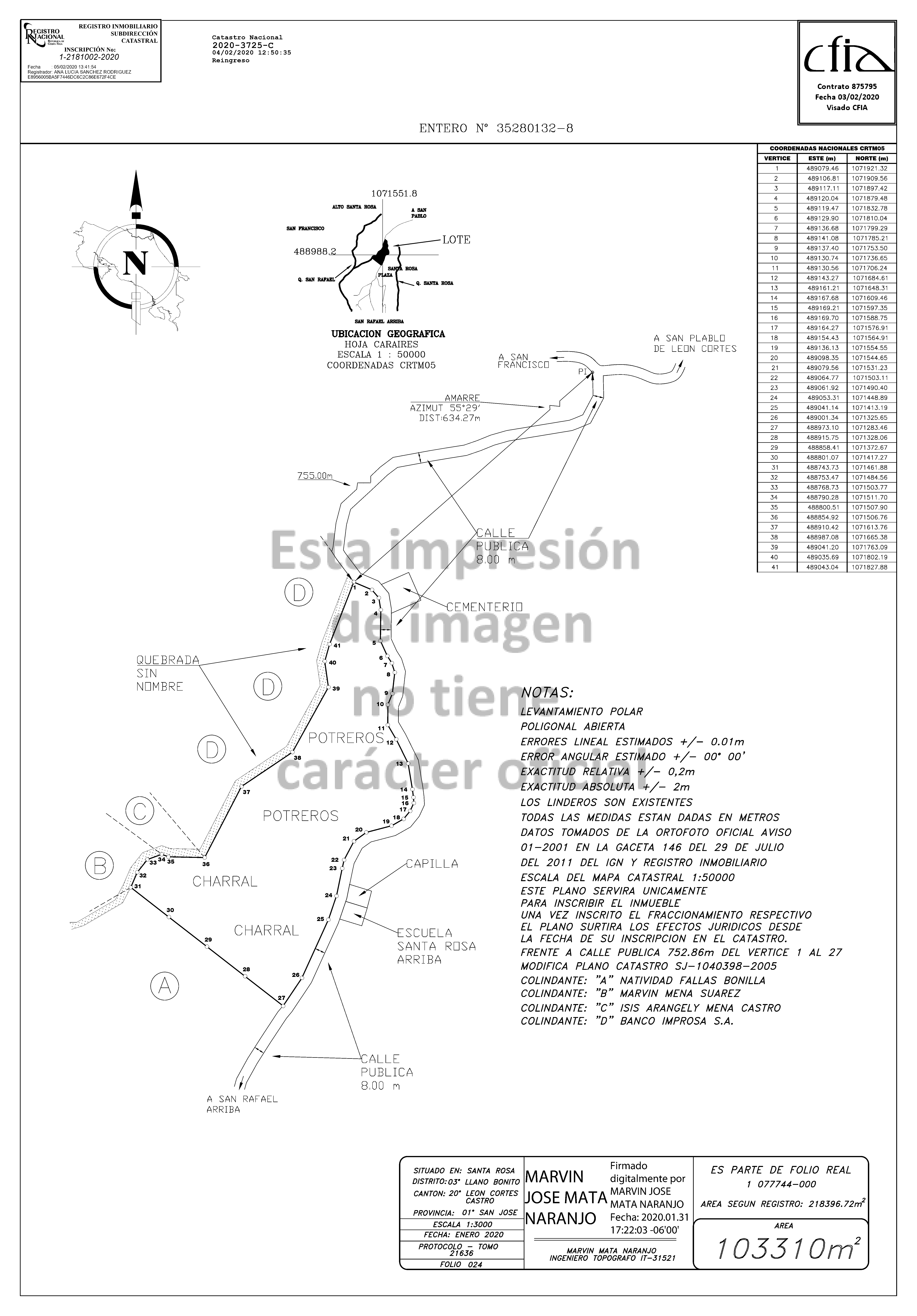 Indica el informe de avalúo: "Finca ubicada en Santa Rosa, Llano Bonito León Cortez. Finca actualmente en potrero, tacotal y maderables en parte, al momento de la inspección se encuentra en mal estado de mantenimiento general. El riesgo de erosión por la quebrada es bajo. Sin embargo, tiene riesgo alto de deslizamiento dada su pendiente alta. El comprador acepta el terreno con los linderos y las medidas señaladas en el cartel de venta, las cuales se indican en el avalúo supra indicado de la propiedad de acuerdo al plano catastrado y a lo que indica el estudio del Registro Nacional; cualquier diferencia de cabida existente contra la comprobación de campo, quedará a discreción del comprador realizar los trámites legales para su reposición o rectificación; asumiendo el comprador por su cuenta los gastos que genere esa gestión; por lo cual el comprador exonera al Banco Nacional de Costa Rica, sus funcionarios y notario a cargo de realizar la escritura, de cualquier responsabilidad presente o futura por la diferencia de cabida, y renuncia de antemano a cualquier reclamo posterior judicial, administrativo o penal con la firma del cartel de venta y/o formulario de oferta de compra.