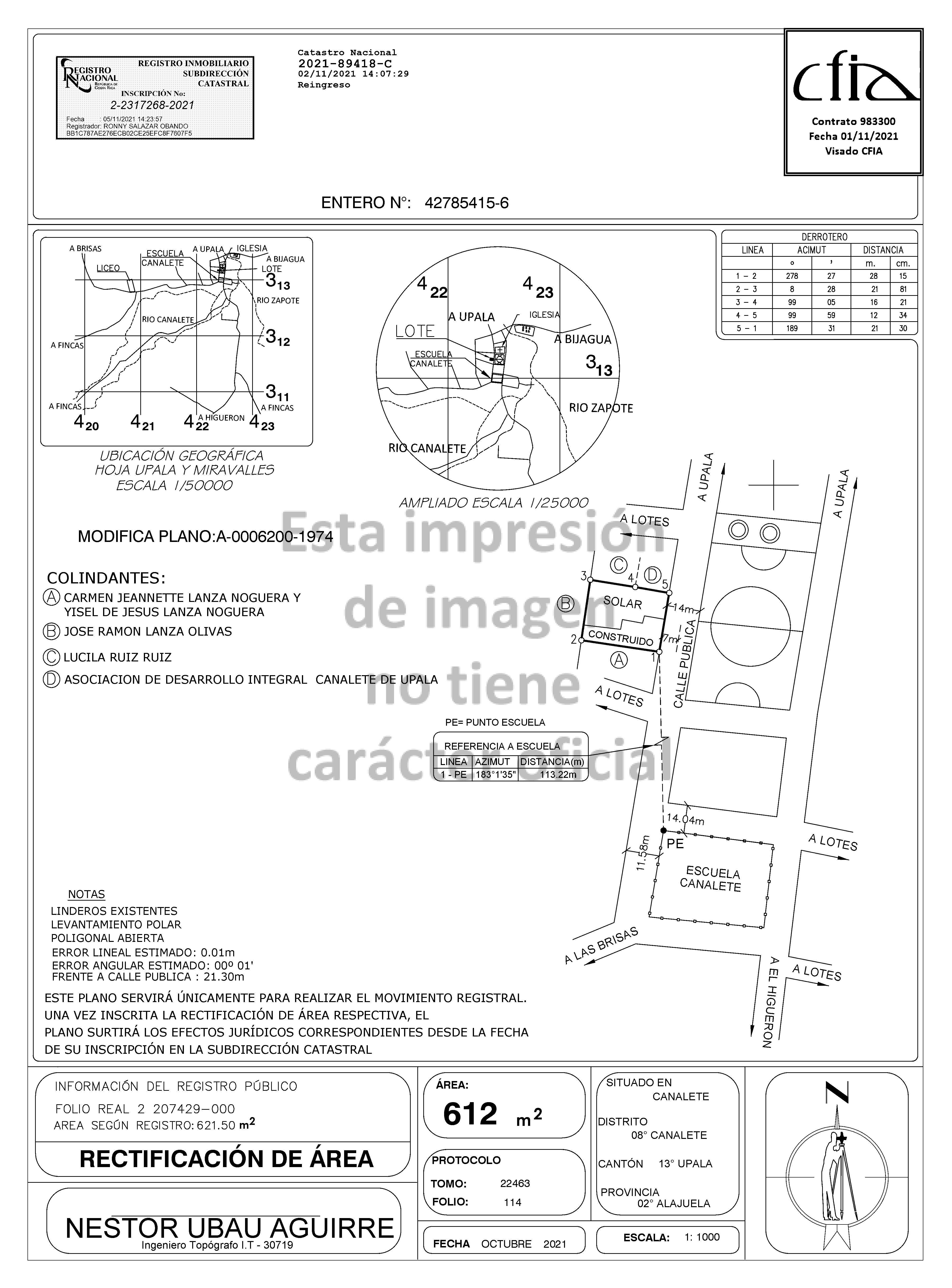 El Banco Nacional de Costa Rica vende este inmueble con base en el plano A-2317268-2021, que está inscrito en Registro y relacionado con este inmueble, así como con el avalúo 214-21308020742900-2025-U realizado por Randy Antonio Umaña Picado y el cartel de venta.
