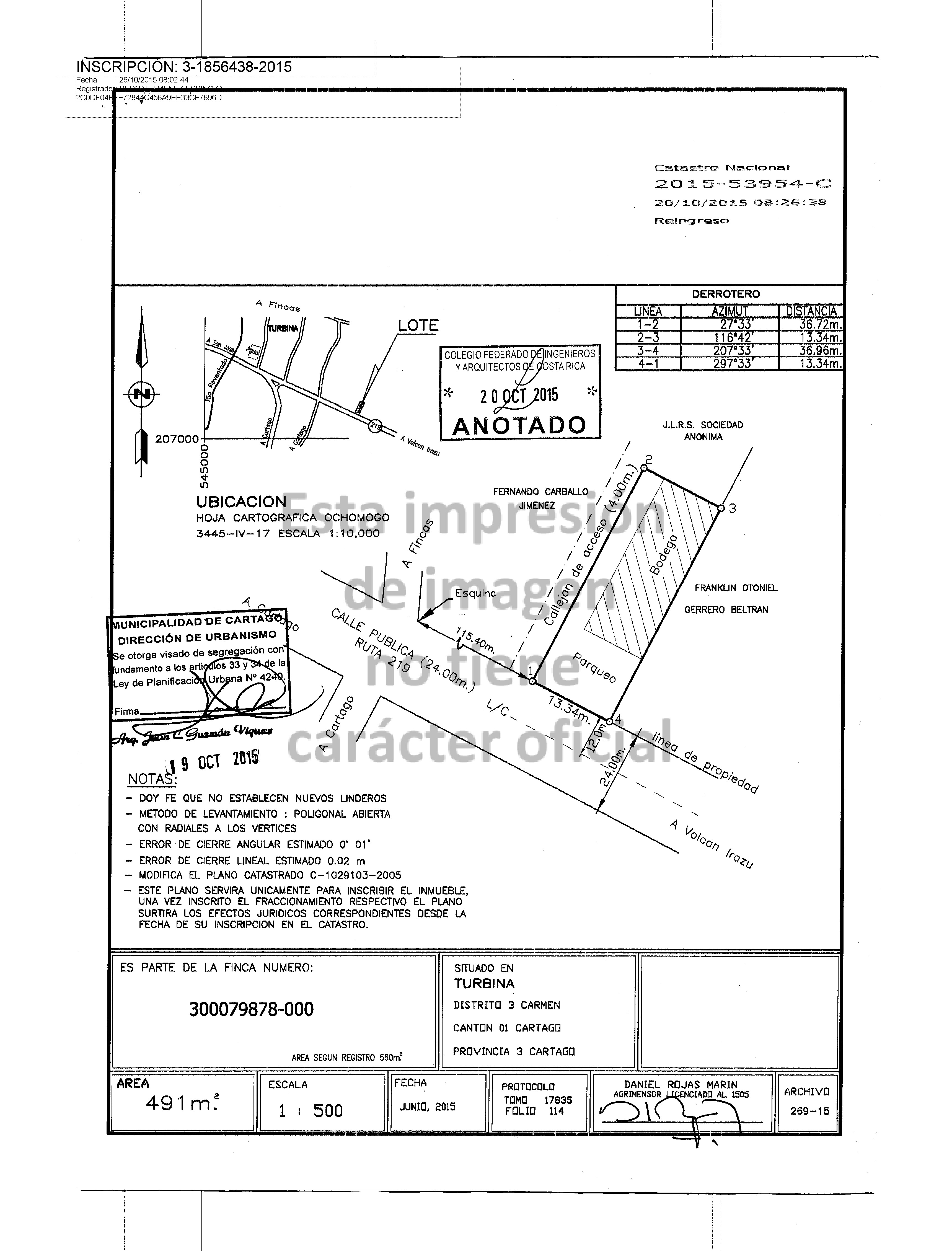 El comprador acepta el terreno con los linderos y las medidas señaladas en el cartel de venta, las cuales se indican en el avalúo supra indicado de la propiedad de acuerdo al plano catastrado y a lo que indica el estudio del Registro Nacional; cualquier diferencia de cabida existente contra la comprobación de campo, quedará a discreción del comprador realizar los trámites legales para su reposición o rectificación; asumiendo el comprador por su cuenta los gastos que genere esa gestión; por lo cual el comprador exonera al Banco Nacional de Costa Rica, sus funcionarios y notario a cargo de realizar la escritura, de cualquier responsabilidad presente o futura por la diferencia de cabida, y renuncia de antemano a cualquier reclamo posterior judicial, administrativo o penal con la firma del cartel de venta y/o formulario de oferta de compra.