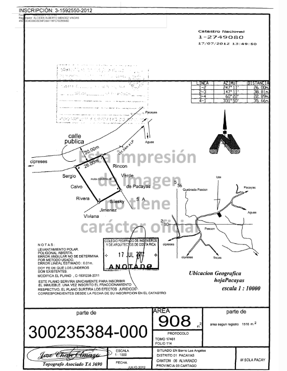Nota: propiedad requiere delimitación y cercado de los vértices por parte de un topógrafo con mojones de cemento para definir el perímetro del terreno este gasto corre por cuenta del eventual adjudicatario, cualquier diferencia de cabida existente contra la comprobación de campo, quedará a discreción del comprador realizar los trámites legales para su reposición o rectificación, por lo que el comprador exonera al Banco Nacional de Costa Rica  de cualquier responsabilidad presente o futura por el exceso o faltante y renuncia a cualquier reclamo posterior judicial y/o administrativo con la firma del cartel de venta y/o formulario de oferta de compra.