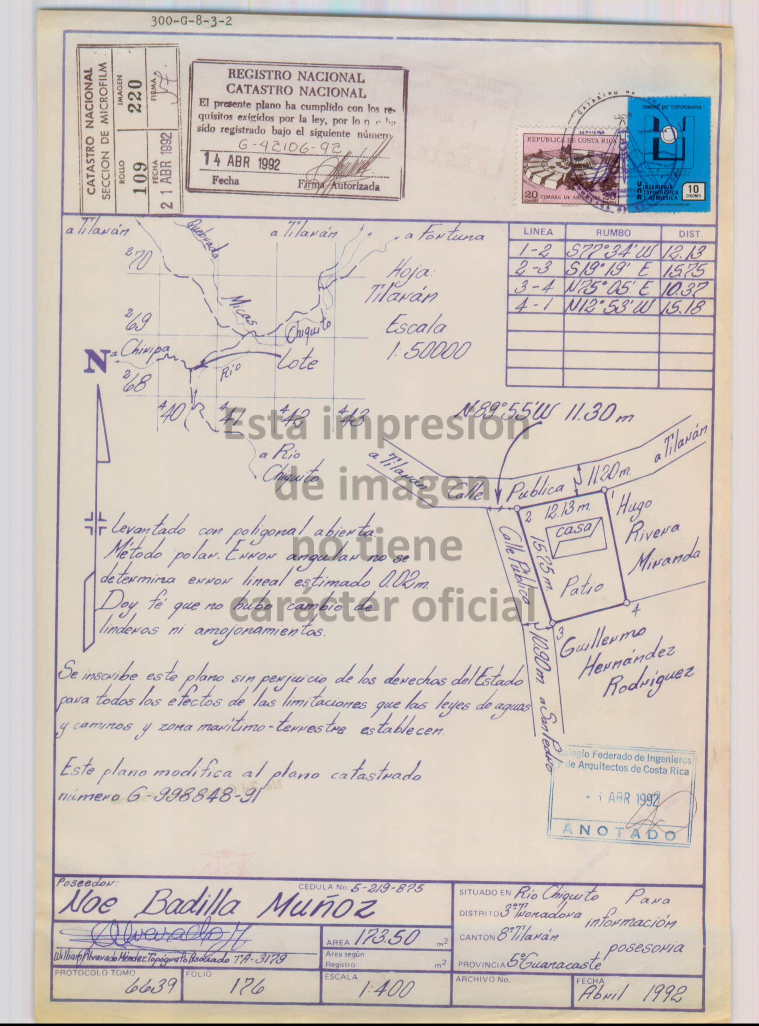 Terreno de topografía ondulada. El Banco Nacional de Costa Rica vende este terreno con construcciones, tomado en referencia con base en el plano G-0042106-1992, que está inscrito en catastro, así como se indica en el avalúo 214-50801009416700 realizado por Ing Ariel Garcia Lopez carnet IT-27320 informe realizado 04 de Setiembre del 2024 . Según indica el Registro Público el inmueble matrícula folio real número 5-94167-000 de la provincia de Guanacaste tiene una cabida de 173 metros con 50 decímetros cuadrados, El comprador acepta el terreno y los linderos con la situación indicada anteriormente y el cartel de venta, lo cual se indica en el avalúo 214-50801009416700 -supra indicado de la propiedad y sin demarcación topográfica de acuerdo al plano catastrado y a lo que indica el estudio del Registro Nacional, cualquier diferencia de cabida existente contra la comprobación de campo, quedará a discreción del comprador realizar los trámites legales para su reposición o rectificación. Asumiendo el comprador por su cuenta los gastos que genere esa gestión. Se adjunta nota del Perito: Se recomienda un replanteo topográfico a fin de determinar su es necesario elaborar un plano nuevo, dadas ciertas diferencias entre plano y la realidad en el sitio por que el lindero 2-3 presenta una medida notablemente superior en la realidad, Además es preciso gestionar las inconsistencias y modificaciones indicadas en el certificado Inmobiliario. La vivienda presenta un deterioro notable dado el abandono. No tiene Cielo, el piso tiene acabado en ocre, en su totalidad. La pintura esta desprendida por placas en todas las paredes. La cubierta urge de mantenimiento, incluso presenta señas de oxido, Es preciso recubrir partes de las paredes livianas en la cocina y el cuarto de pilas.