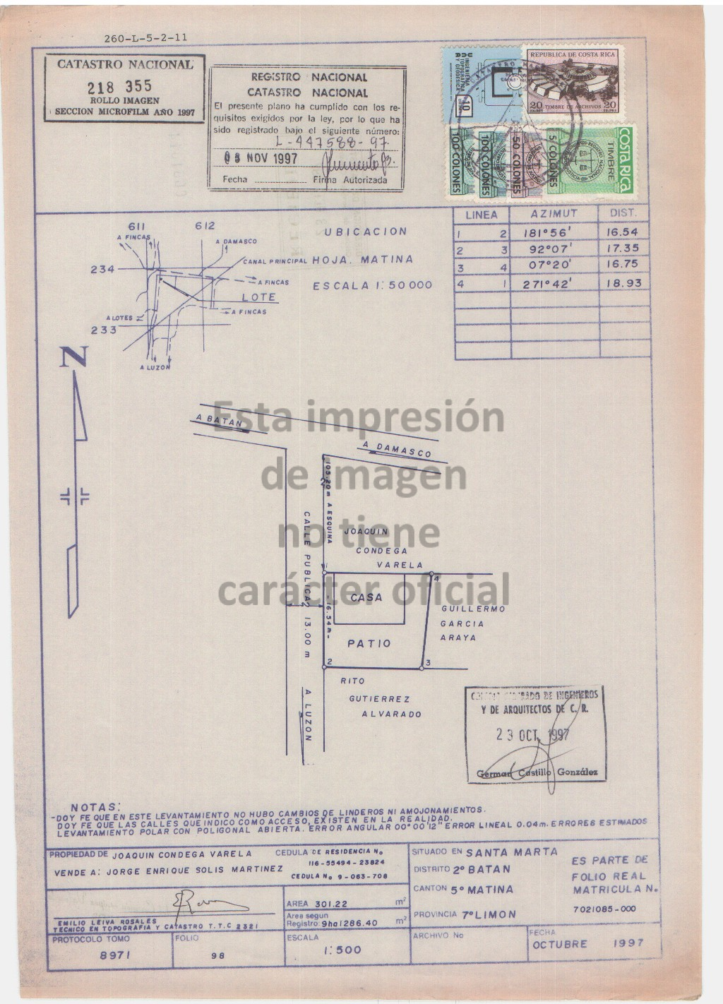 El Banco Nacional de Costa Rica vende este inmueble con base en el plano L-0447588-1997, que está inscrito en el registro público y relacionado con este inmueble, así como con el avalúo 214-70502009410800-2025-U realizado por Minor Diego Murillo Gamboa el 01 de octubre 2025, el cartel de venta y el estudio registral adjunto.