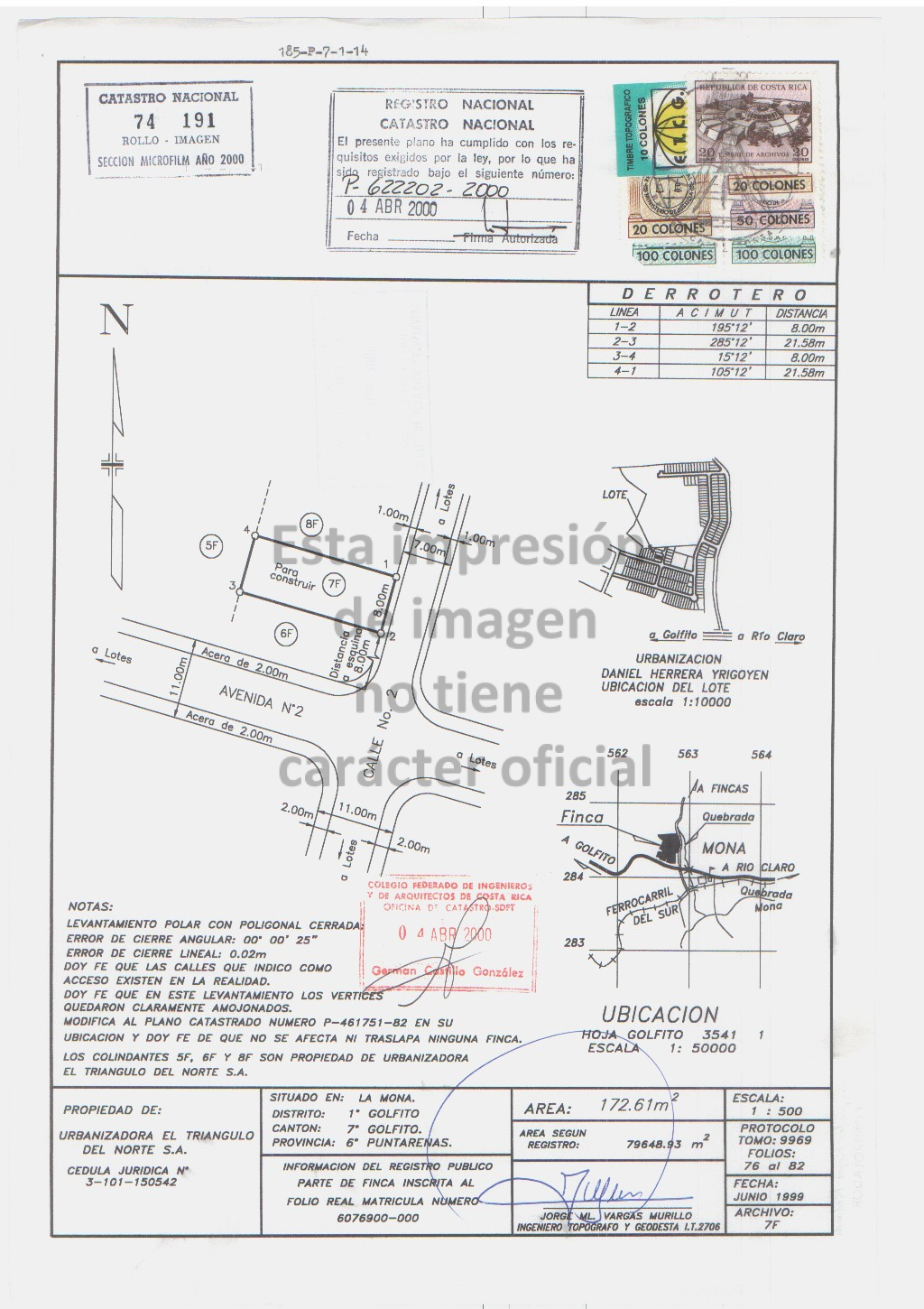 Dirección inmueble: SITUADA EN EL DISTRITO 1-GOLFITO CANTON 7-GOLFITO DE LA PROVINCIA DE PUNTARENAS, urbanización Daniel Herrera, Lote 7-F. Plus Code: JW34+82J Mona,